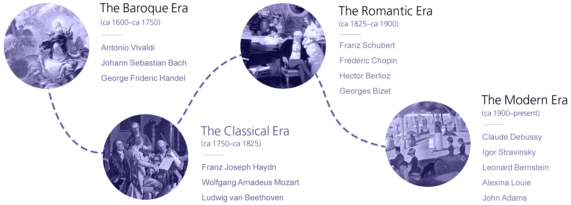 Travel on a musical journey to discover the styles, genres, composers and their masterworks that helped shape the Baroque, Classical, Romantic, and Modern eras!