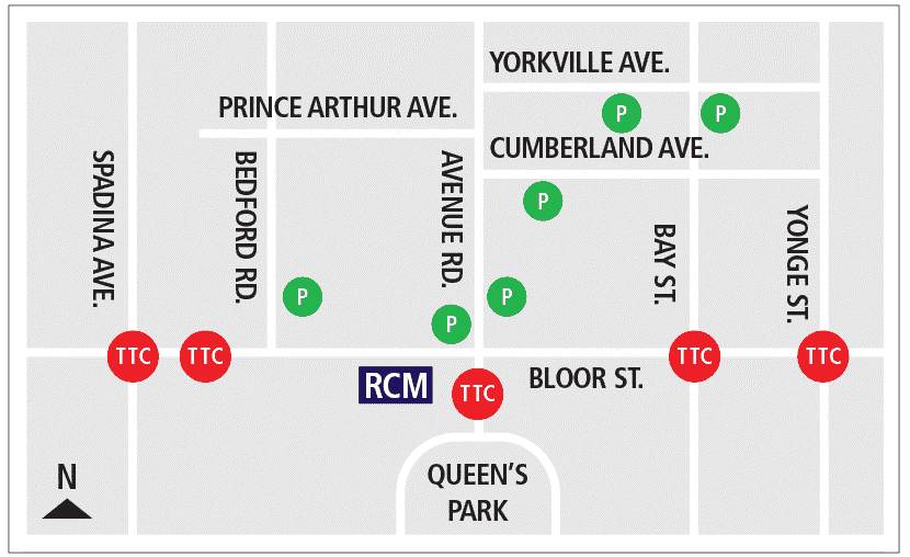 Take the TTC subway to Museum station (Yonge-University line). You will be facing north and the ROM will be on your left when you exit the subway, walk half a block north to Bloor Street and Avenue Road, and turn left and walk one block west (we are next door to the ROM).